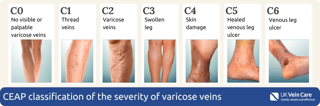 The most common tool according to CEAP is the clinical part, C, where the varicose veins are divided into seven severity grades. C0 - zero C - is the lowest grade and it means that there are no traces of either spider veins or varicose veins on the legs.