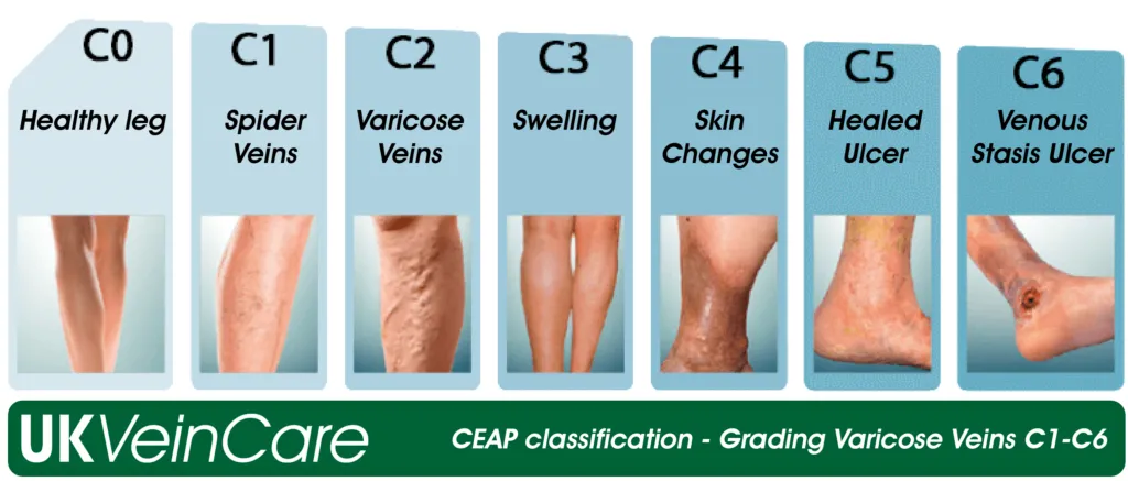 Varicose veins are classified according to the CEAP system, which grades varicose veins from 1-6.