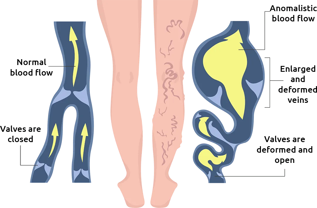 Varicose veins form when the venous valves do not function correctly, allowing blood to flow back in the veins. These venous valves ensure that blood flows in one direction, towards the heart. If these valves are damaged, they no longer close properly, which allows blood to flow in the wrong direction. This increases blood pressure and causes varicose veins that become visible on the legs.